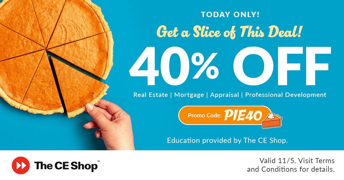 Tomorrow only you can take 40% off all Real Estate, Mortgage, Appraisal, and Professional Development courses when you visit The CE Shop and use promo code PIE40 at checkout! It’s the perfect way to invest in your success, plus, it's as easy as pie. Valid tomorrow only, 11/5/25.
